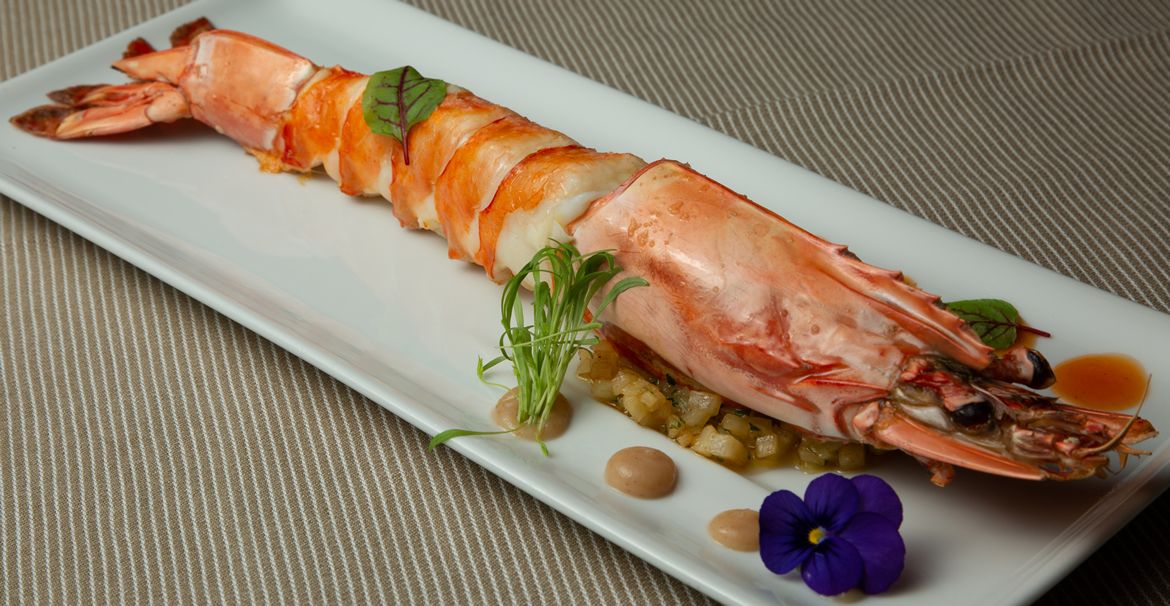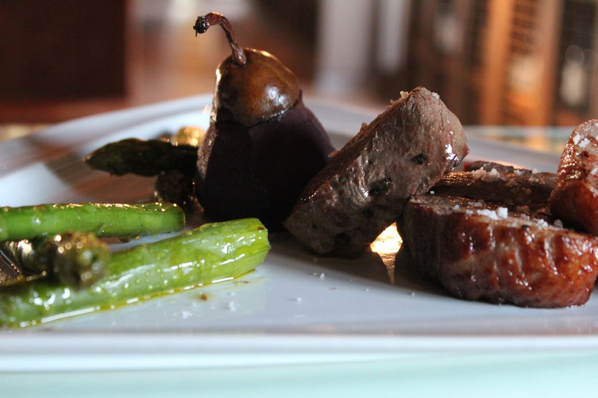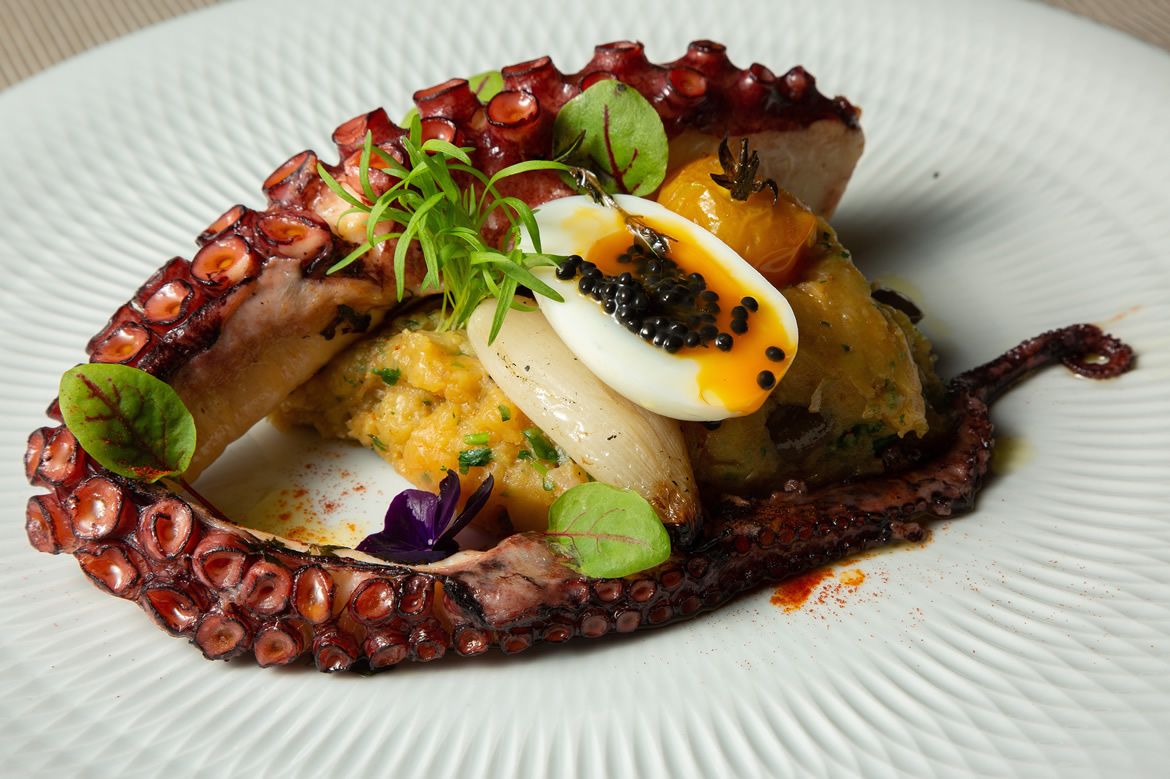 - Cod loin confit, mashed potatoes, onion puree and bell pepper foam