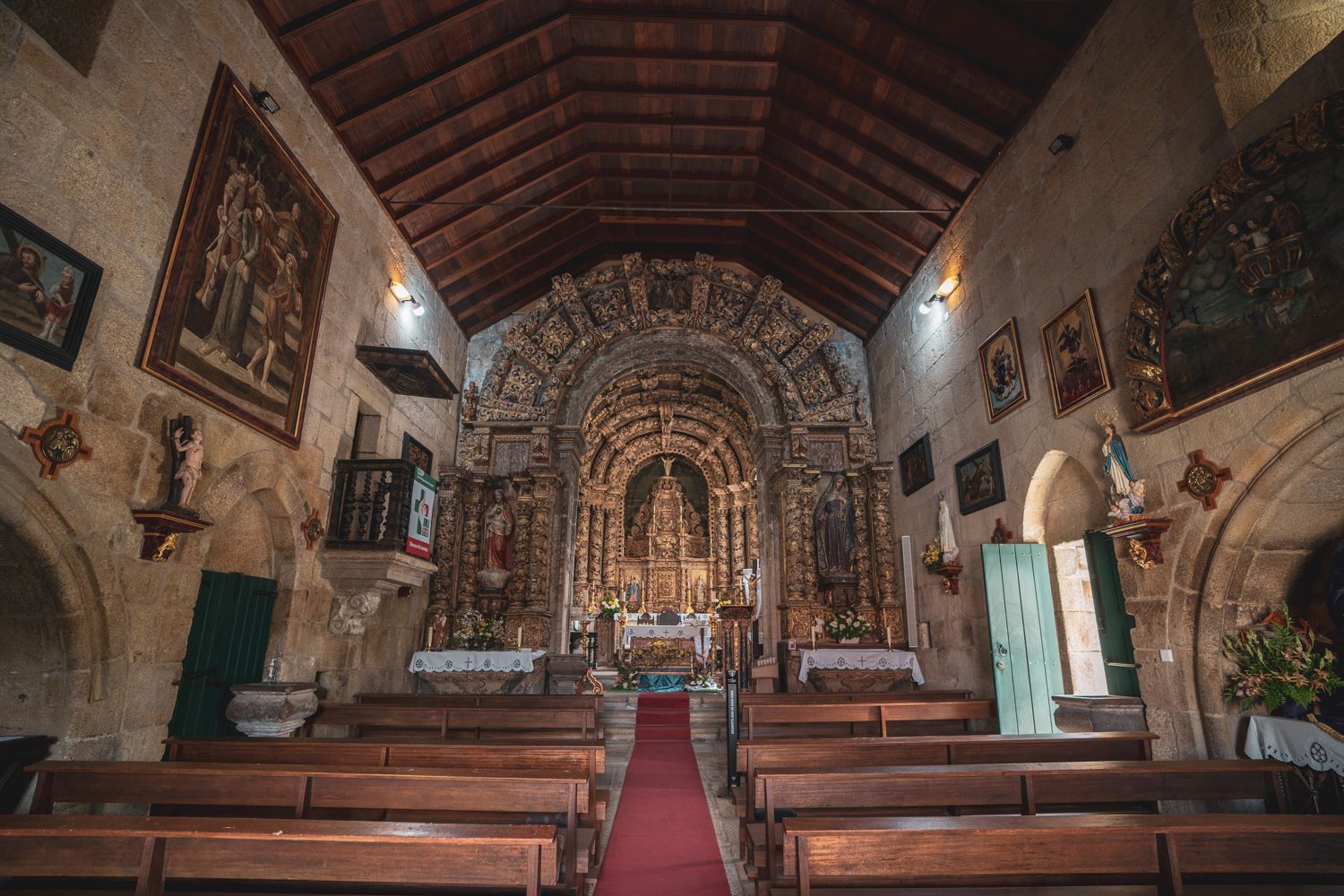 One of the greatest highlights, however, is the medieval mural painting, hidden behind the main altarpiece, depicting Our Lady with the child on her lap, flanked by St. John the Evangelist (on the left) and St. Peter (on the right). It was studied in 1986 by the Mural Painting Division of the José de Figueiredo Institute, which concluded that it would be impossible to restore it without removing the altarpiece structure.