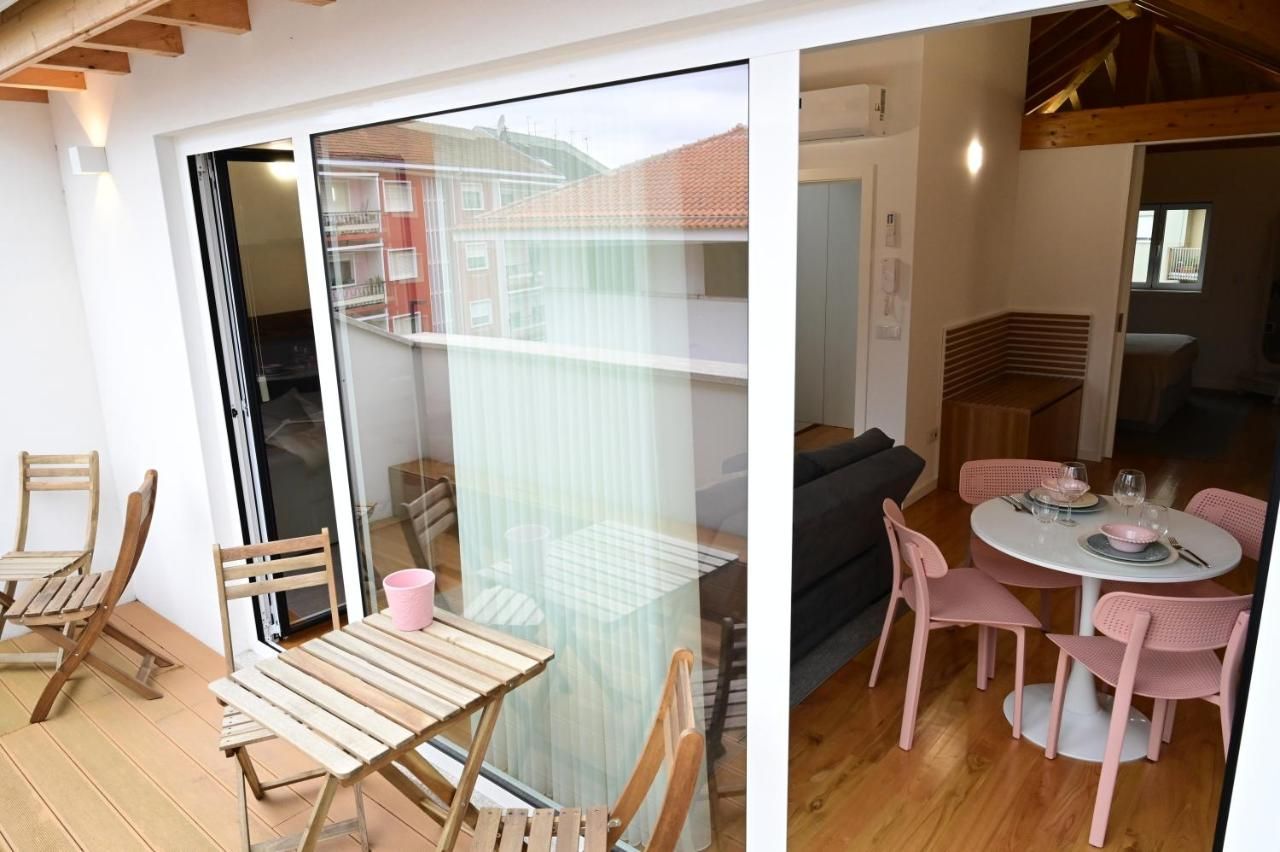 O apartamento, no 2º piso, possui uma varanda panorâmica com vista para a Avenida 5 de Outubro, uma das principais vias da cidade. Combina conforto e design com uma decoração moderna, simples e funcional. A sala é acolhedora e ideal para relaxar, apresentando um ambiente elegante e confortável para os hóspedes.